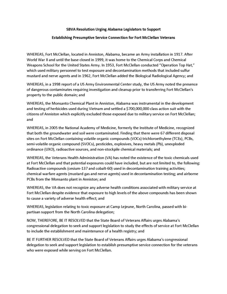 The State Board of Veterans Affairs (SBVA) unanimously passed a resolution urging Alabama Legislators to support establishing a health registry and presumptive service connection for Veterans who served on Fort McClellan.