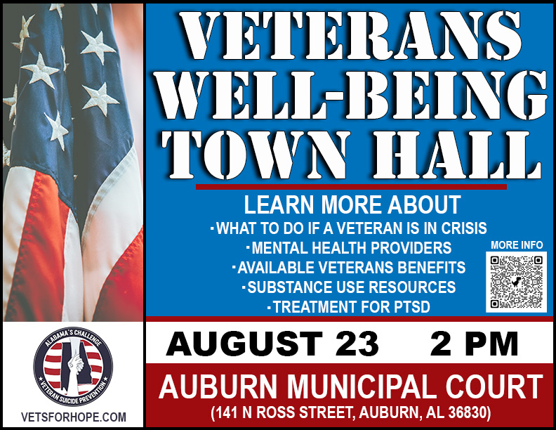 The Partners of Alabama’s Challenge urge the Lee County and surrounding communities to attend a veterans well-being town hall on Wednesday, August 23, to address the alarming high veterans suicide rate in Alabama.