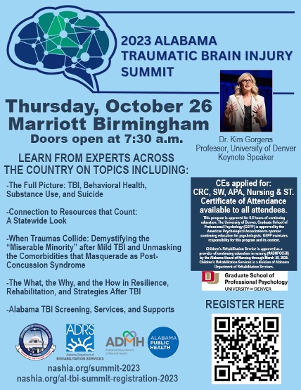 The Alabama Department of Veterans Affairs, Alabama Department of Rehabilitation Services, Alabama Department of Mental Health, and Alabama Department of Public Health are proud to announce the Alabama Traumatic Brain Injury Summit, “Forging Connections: Navigating Traumatic Brain Injury,” set to take place at the Marriott-Birmingham on October 26, 2023, from 8:00 AM to 4:30 PM.
