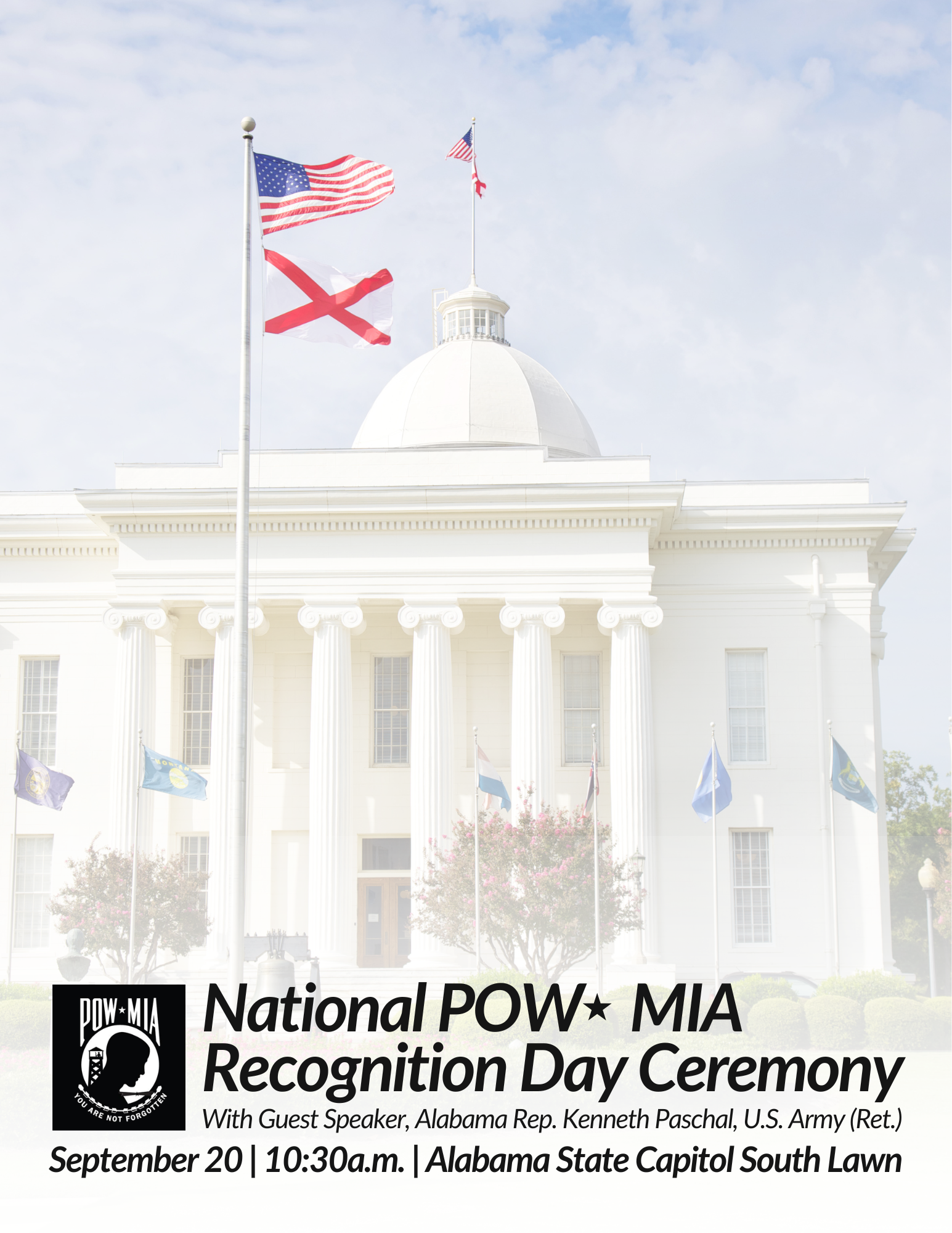 A ceremony to commemorate National POW/MIA Recognition Day will be held on the South Lawn of the Alabama State Capitol at 10:30 a.m. on Saturday, Sept. 20.